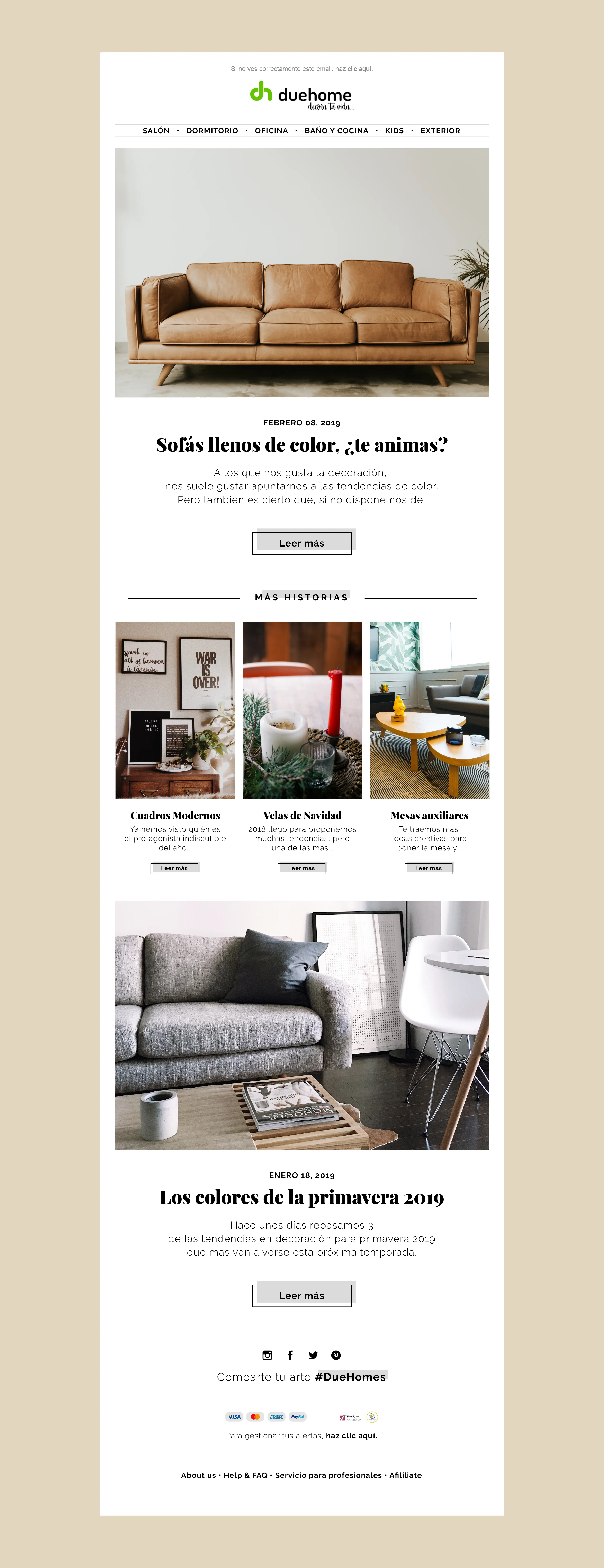 These newsletters were designed to promote duehome’s new furniture arrivals through a clean, warm, and easy-to-navigate layout. The goal was to spotlight key pieces while offering a welcoming visual tone that reflects the brand’s accessible, contemporary style. Lifestyle-driven imagery and clear product highlights help guide the user through the selection with simplicity and comfort.