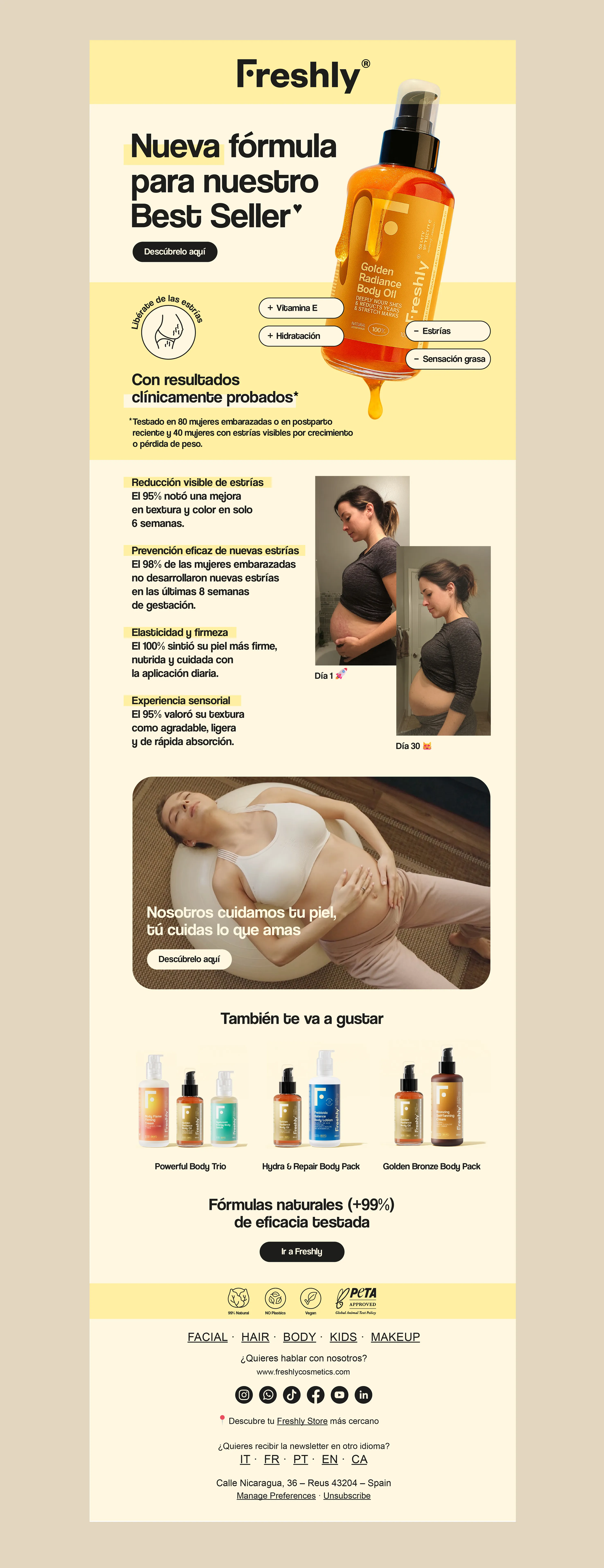 This project involved creating a product launch newsletter for Freshly Cosmetics, highlighting the new formulation of one of their best-selling products. The goal was to communicate the improvements while keeping the design aligned with the brand’s aesthetic. The newsletter combines engaging visuals with concise, persuasive copy to inform and excite customers. The layout emphasizes clarity and readability, ensuring the product’s benefits are immediately understood while reinforcing brand identity and driving engagement.